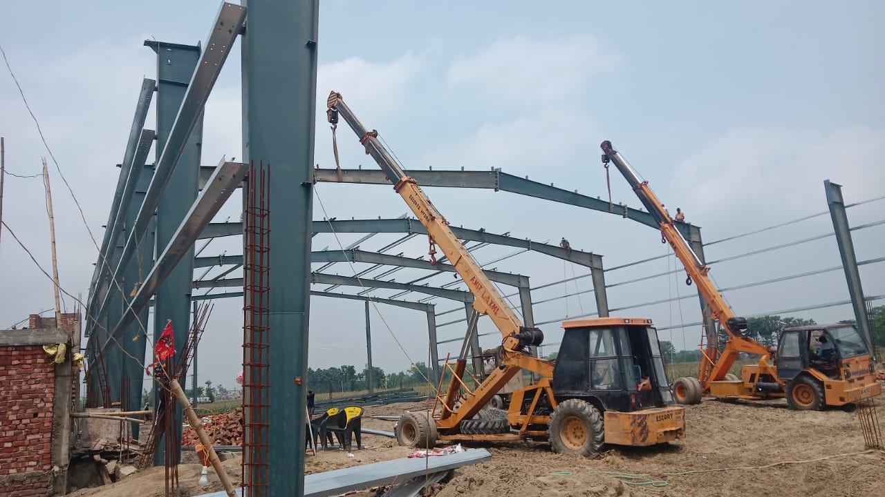 Structural erection using pre-fabricated steel members, roofing, cladding & advanced features mezzanine construction and column-free long spans.
