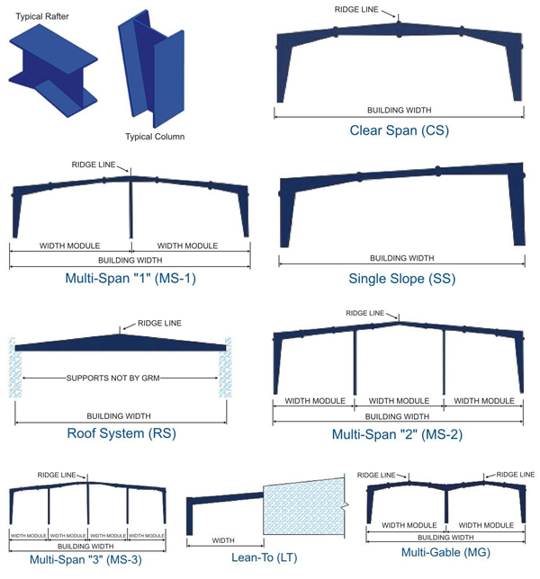 Building Length: The distance between the outside line of one side Gable End Column (End Wall Column) to the outside line of the Gable End Column of the opposite side. Any length is possible.